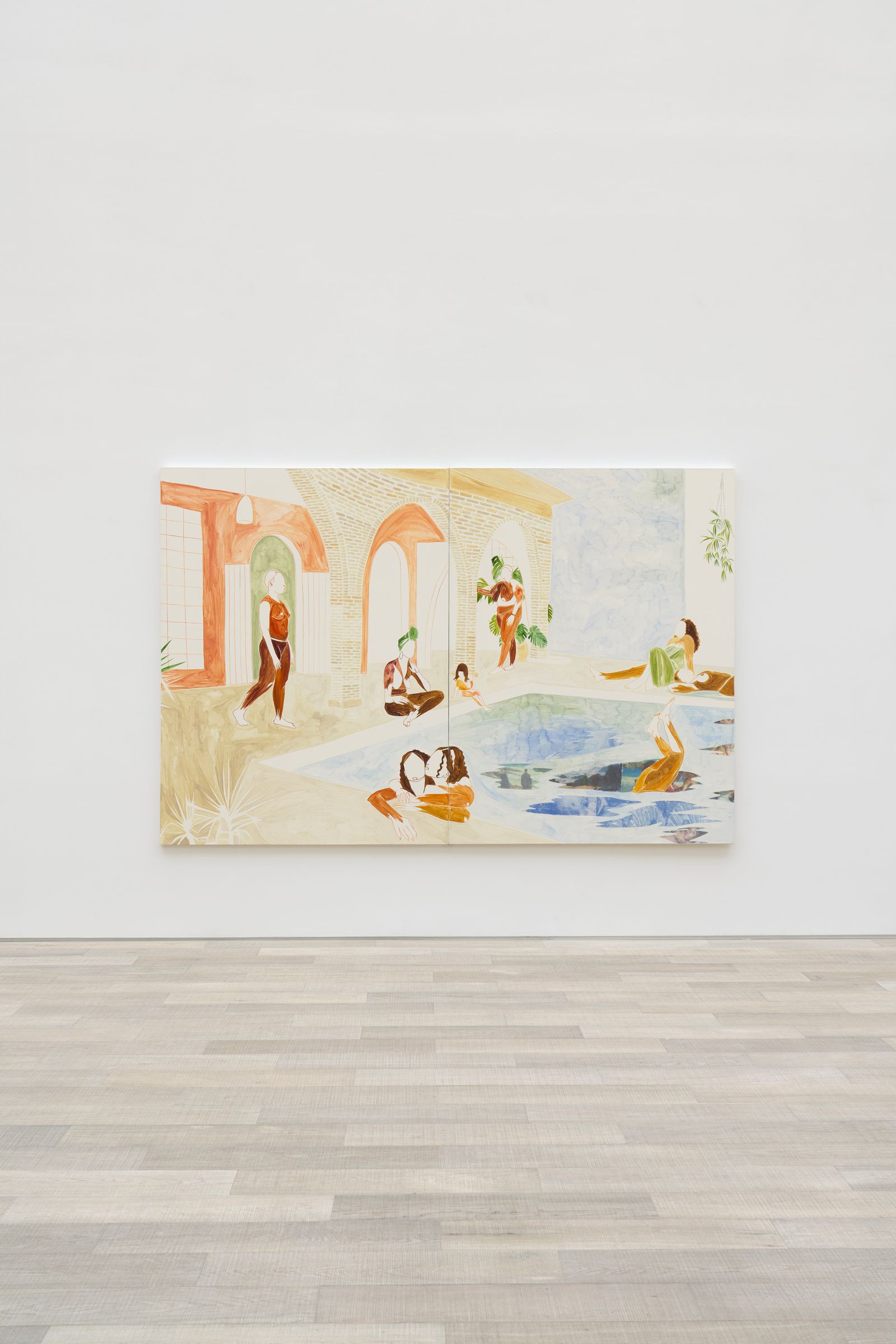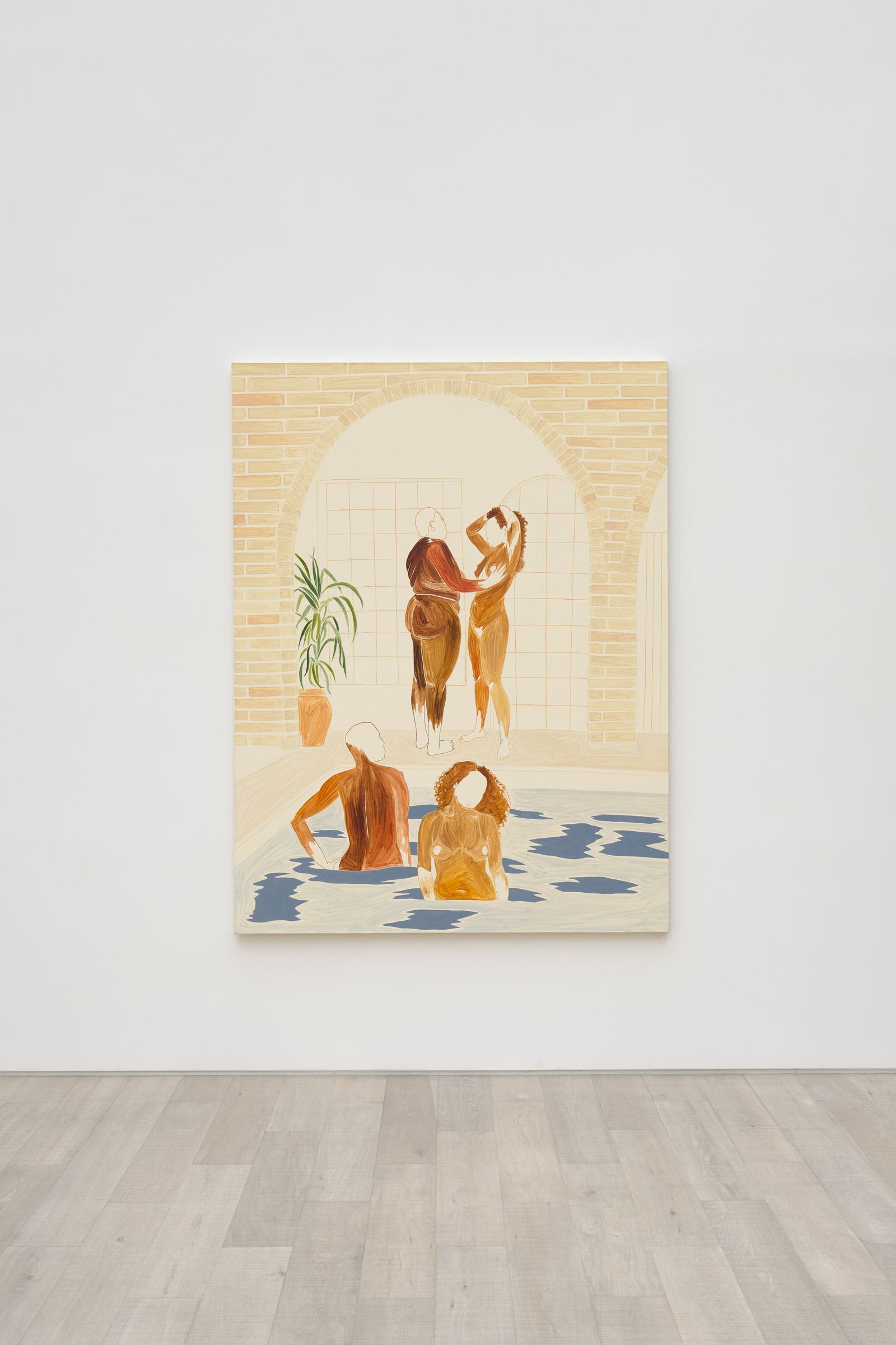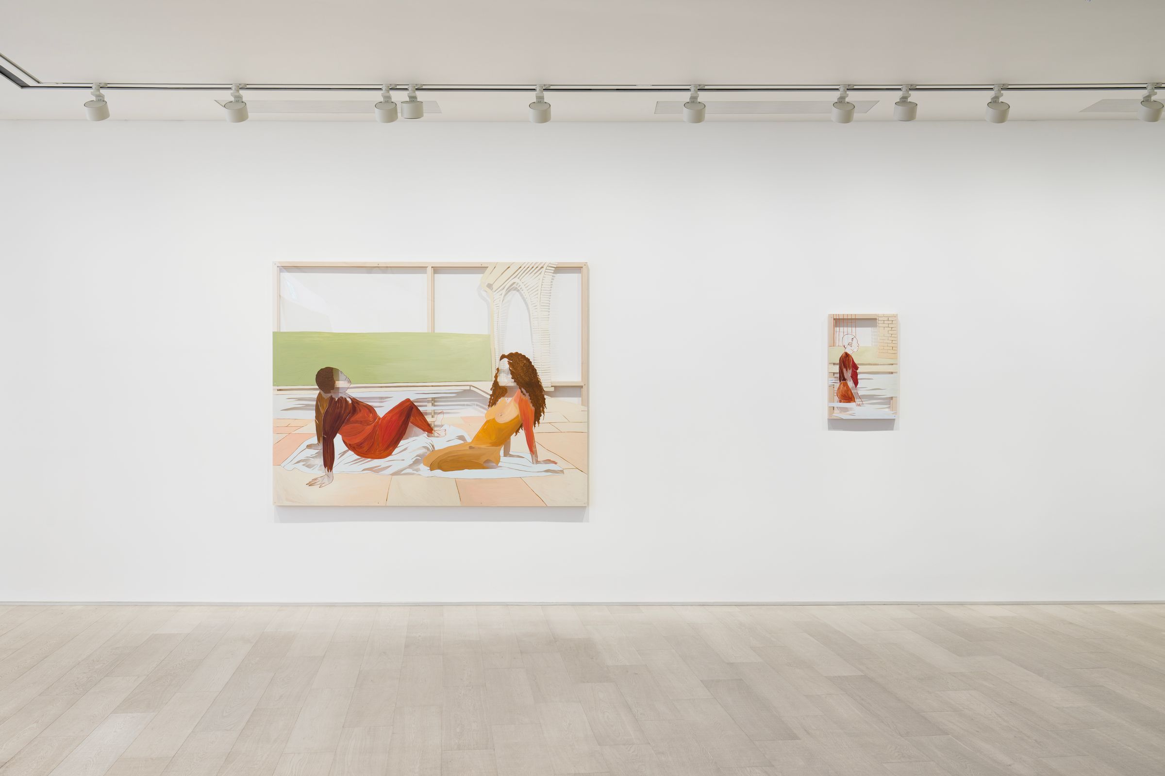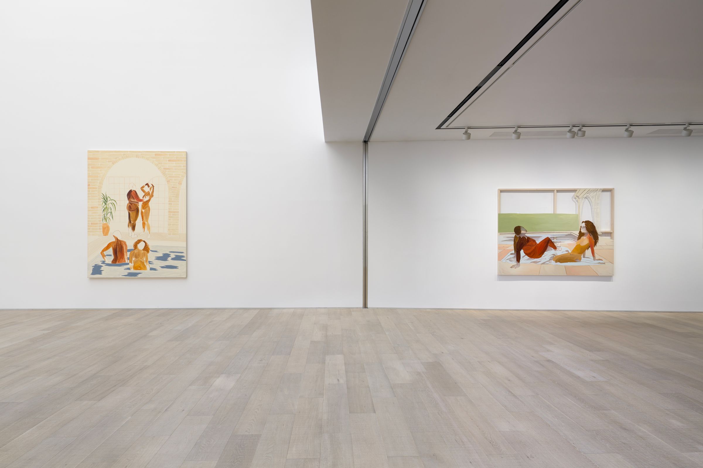 This exhibition unveils new works centered on the theme of bodies of water, weaving together a rich tapestry of narrative and formal references that have profoundly influenced her, including films by Barry Jenkins and Céline Sciamma, literature by K. Patrick and Julia Armfield, and music by Janelle Monáe. Water, as it is explored in her work, is a site of deconstruction and liberation—a place beyond fixed boundaries or the binary order—where identity and sense are deconstructed and reconstructed, a space of transformation and rebirth. Her paintings depict a world where figures and spaces flow together, interacting beyond existing norms and perspectives. Especially in these new works, she delicately illustrates the processes of self-awareness and emotional connection with others through water as a medium, celebrating the beauty and potential of liberated beings and inclusive communities. Her figures are resting in swimming pools or leaning on one another—moments where openness and vulnerability coexist. The waterside serves as a stage where women, freed from social oppression, encounter their inner selves and explore their identities. Forrester’s paintings unfold a world imbued with warmth, inclusion, joy, and freedom, where her subjects dwell sacredly in their everyday existence and desire. In doing so, she blurs fixed boundaries and invites viewers into a deeper emotional realm.