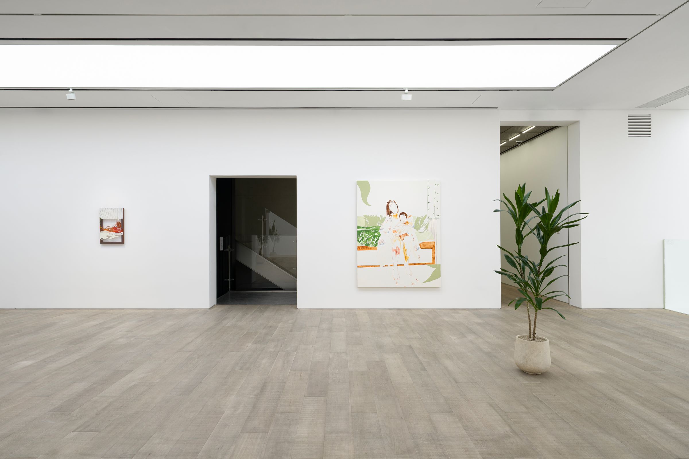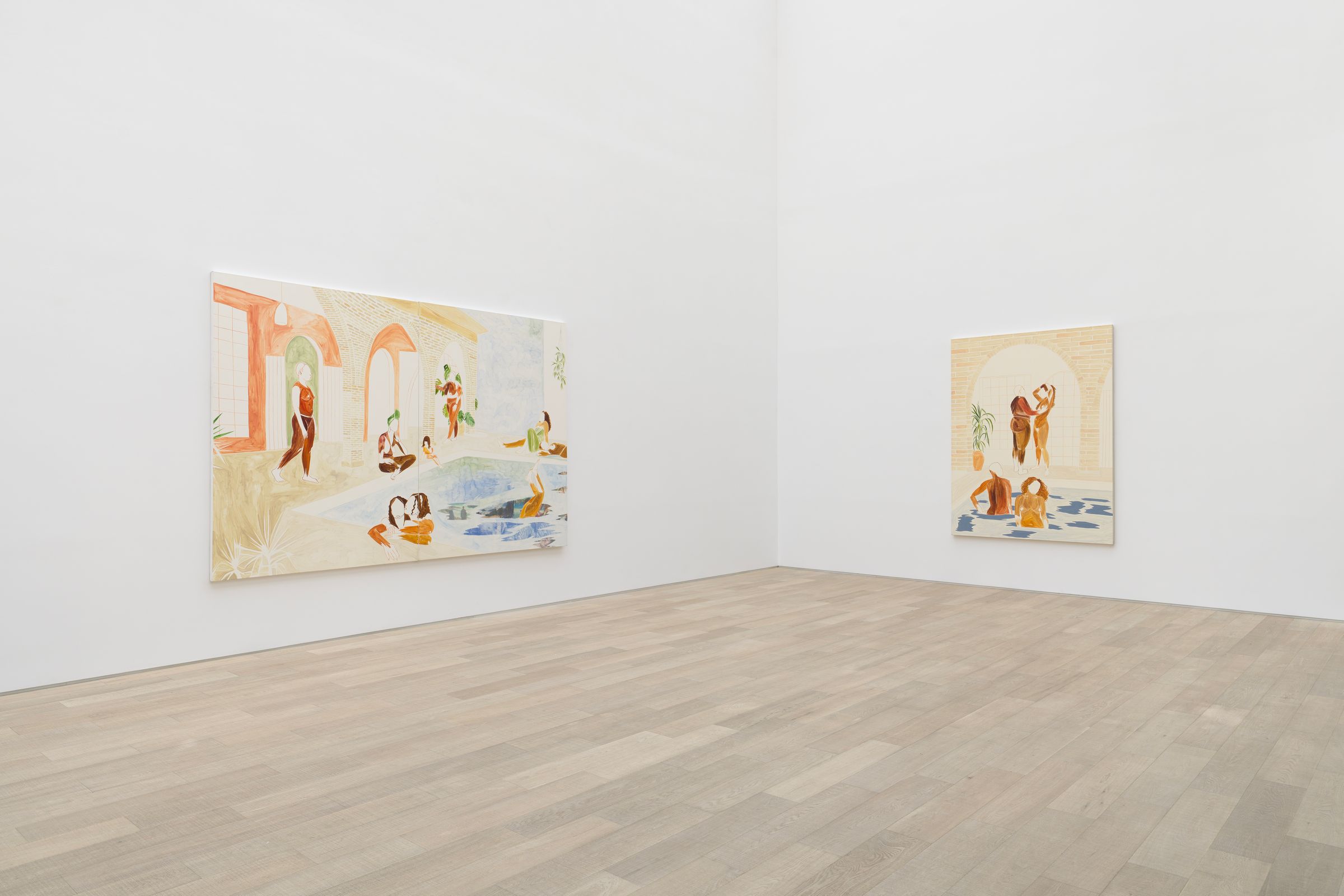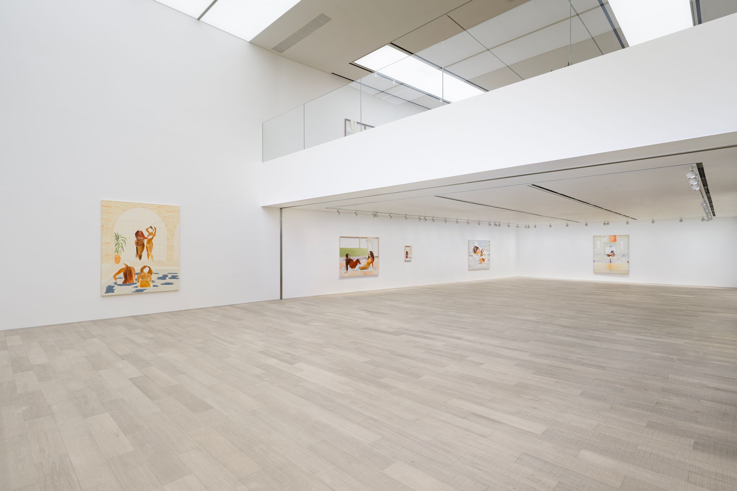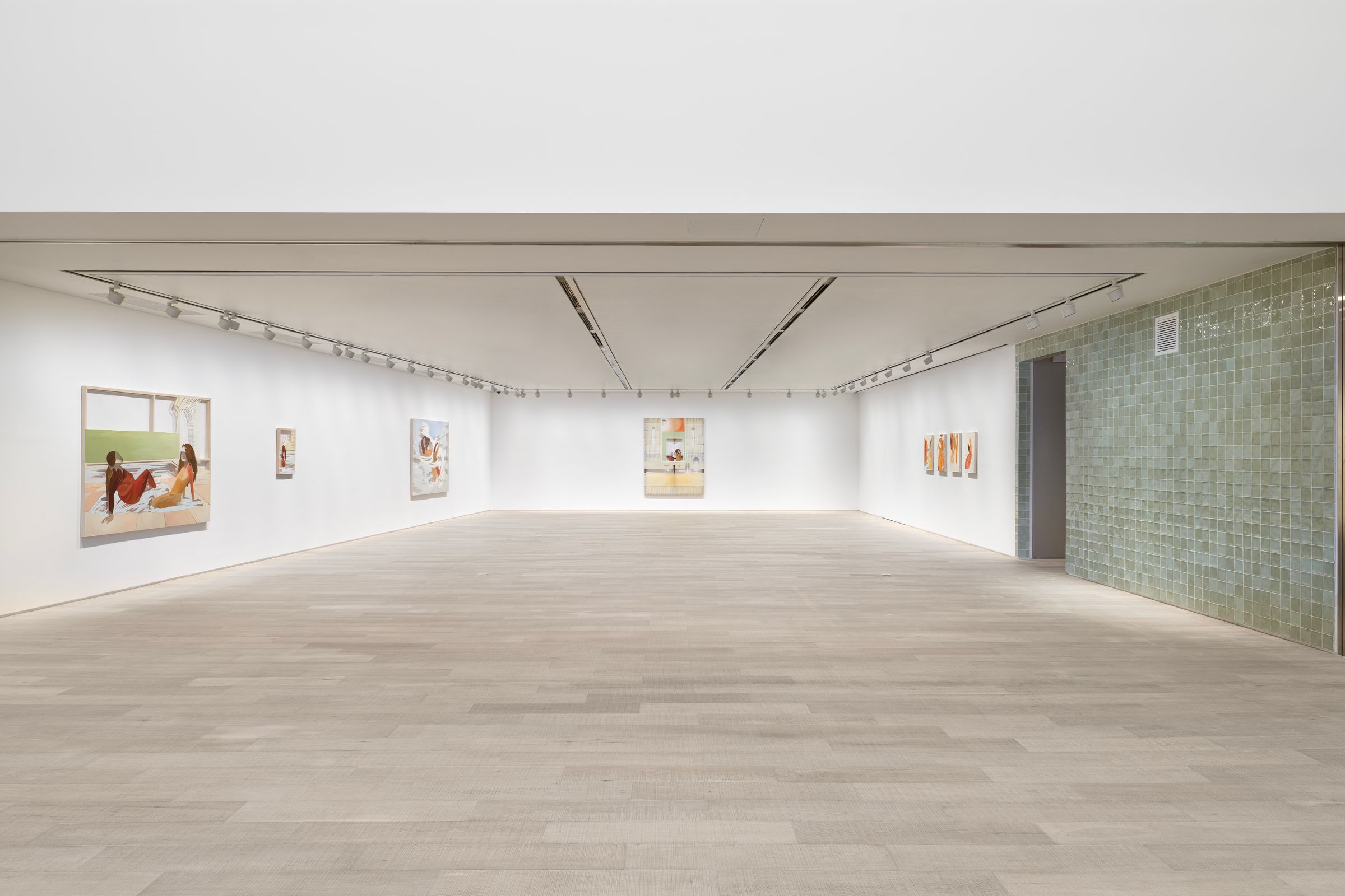 This exhibition unveils new works centered on the theme of bodies of water, weaving together a rich tapestry of narrative and formal references that have profoundly influenced her, including films by Barry Jenkins and Céline Sciamma, literature by K. Patrick and Julia Armfield, and music by Janelle Monáe. Water, as it is explored in her work, is a site of deconstruction and liberation—a place beyond fixed boundaries or the binary order—where identity and sense are deconstructed and reconstructed, a space of transformation and rebirth. Her paintings depict a world where figures and spaces flow together, interacting beyond existing norms and perspectives. Especially in these new works, she delicately illustrates the processes of self-awareness and emotional connection with others through water as a medium, celebrating the beauty and potential of liberated beings and inclusive communities. Her figures are resting in swimming pools or leaning on one another—moments where openness and vulnerability coexist. The waterside serves as a stage where women, freed from social oppression, encounter their inner selves and explore their identities. Forrester’s paintings unfold a world imbued with warmth, inclusion, joy, and freedom, where her subjects dwell sacredly in their everyday existence and desire. In doing so, she blurs fixed boundaries and invites viewers into a deeper emotional realm.