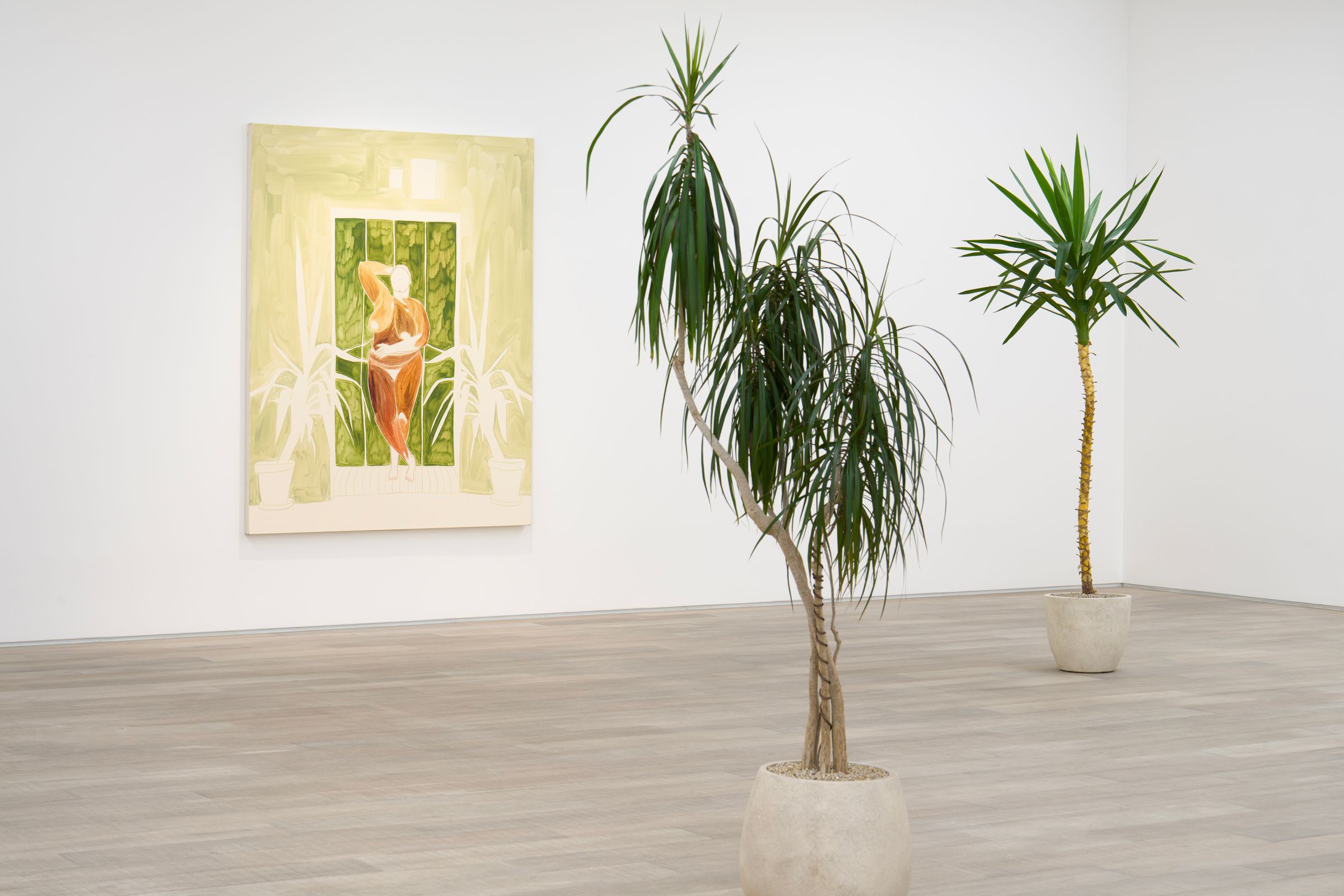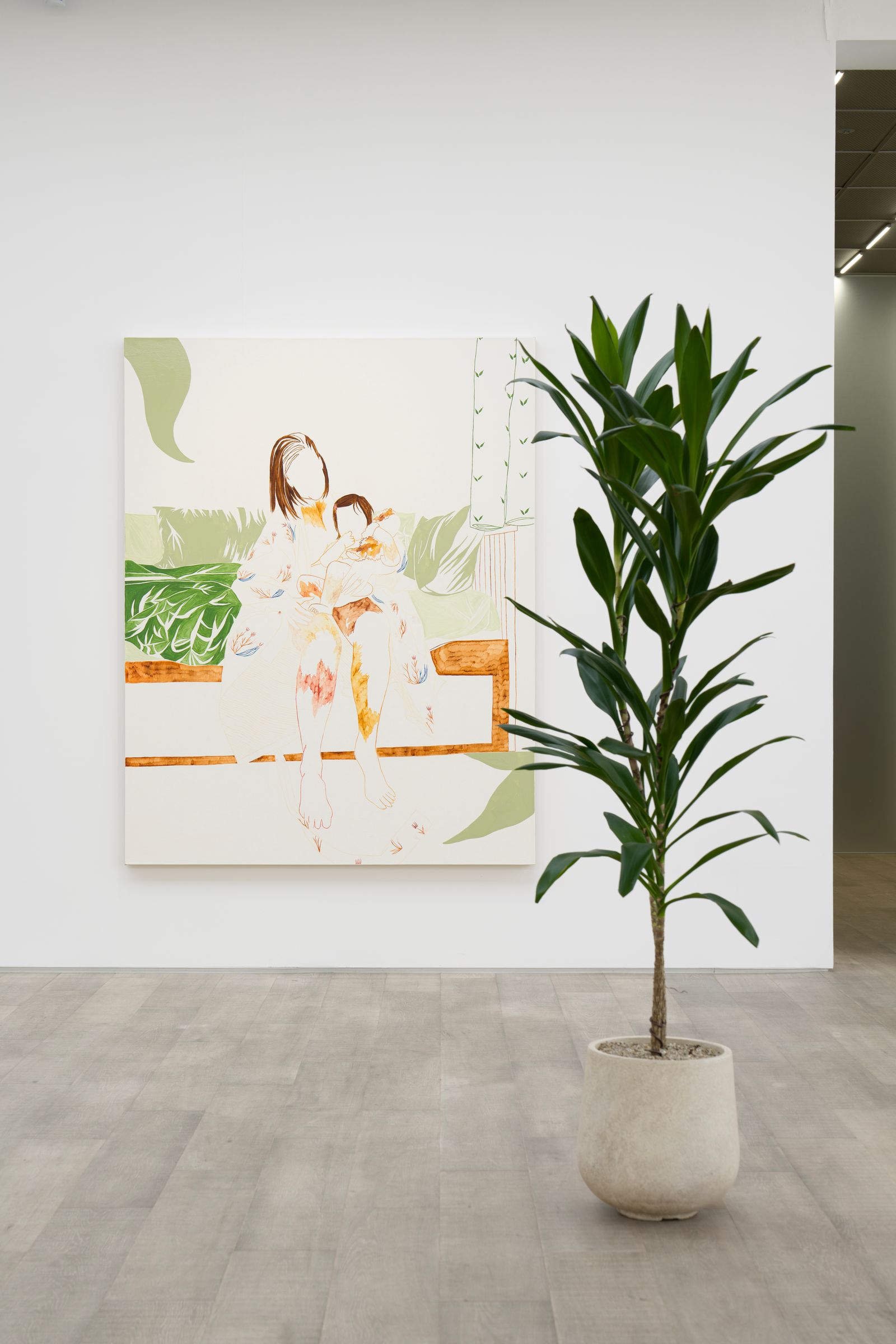 The figures in her paintings exist along the boundary of figuration and abstraction, between presence and disappearance, and are often based on real individuals close to the artist. While maintaining their individuality, they form relationships with one another as fluid and ambiguous beings. Forrester also offers viewers the possibility to project themselves into the work, an experience facilitated by the artist’s distinctive material vocabulary, particularly through the painting’s supports. The line between reality and creation is blurred by Forrester’s choice of polycarbonate as her surface, a material recognized for its transparency and rigidity. This unique use of materials subtly evokes complex and nuanced ideas around femininity, gender, and sexuality through materiality, eliciting tender, flowing reflections on identity and belonging. Furthermore, the reflective surfaces and the walls and shadows visible through the transparent polycarbonate canvas add physical depth to the image and allow for a multilayered visual experience.